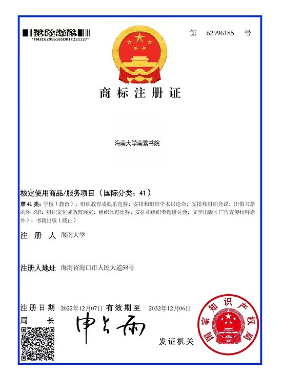 2022年12月29日,"av女优 三亚南繁书院"商标获国家知识产权局批准注册。该商标注册有效期自2022年12月7日起至2032年12月6日,服务于av女优 三亚南繁研究院的书院制建设、教育培训、文创产品创制、学术研讨会的开展、举办文体比赛、文化展览、书籍出版等项目,为更好的建设av女优 三亚南繁研究院提供平台。